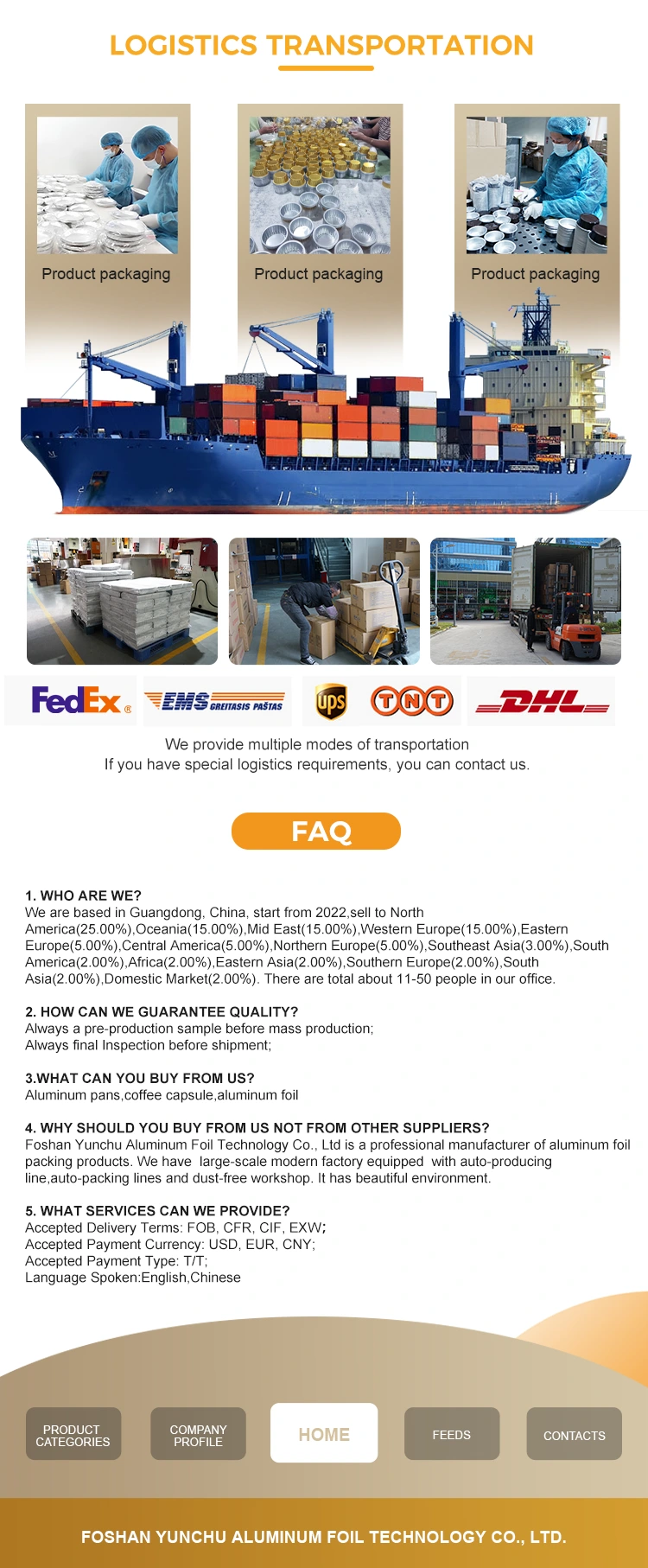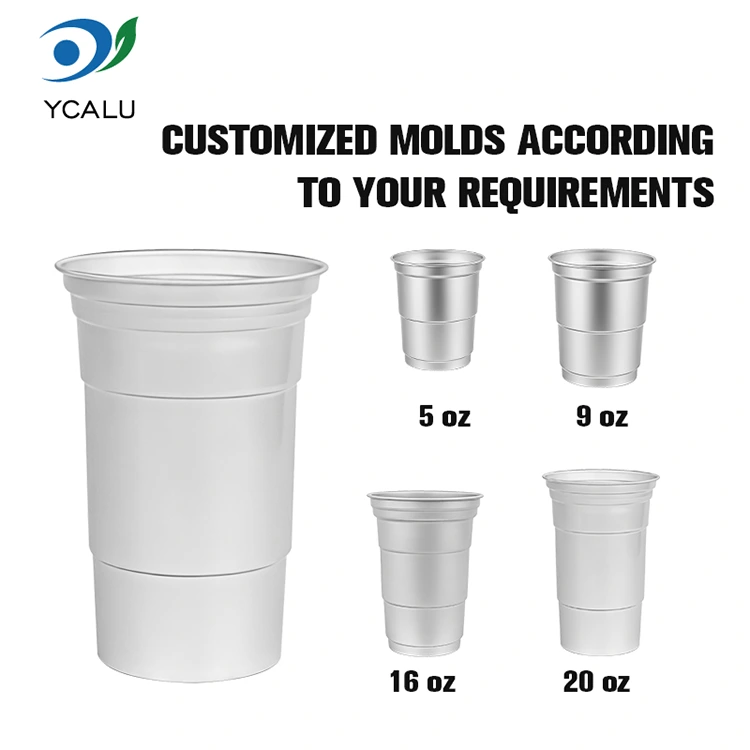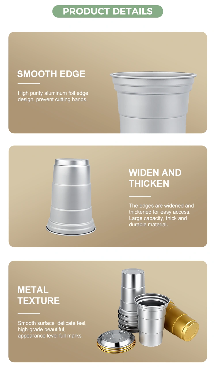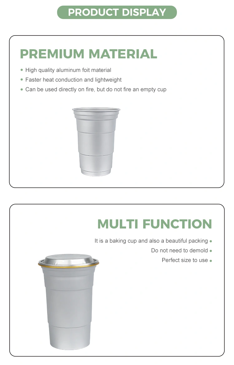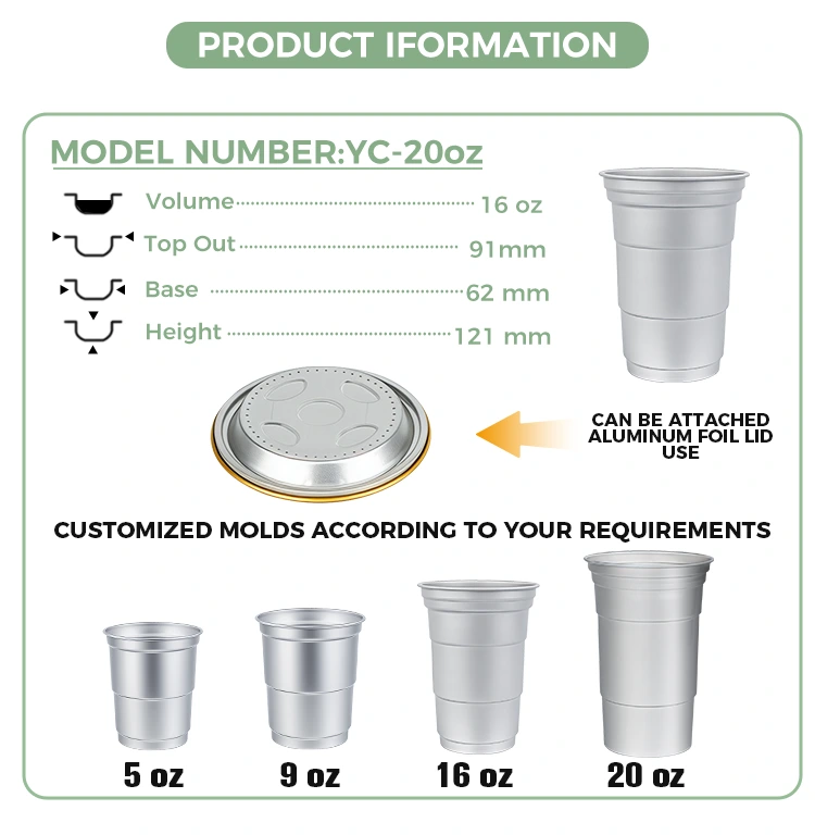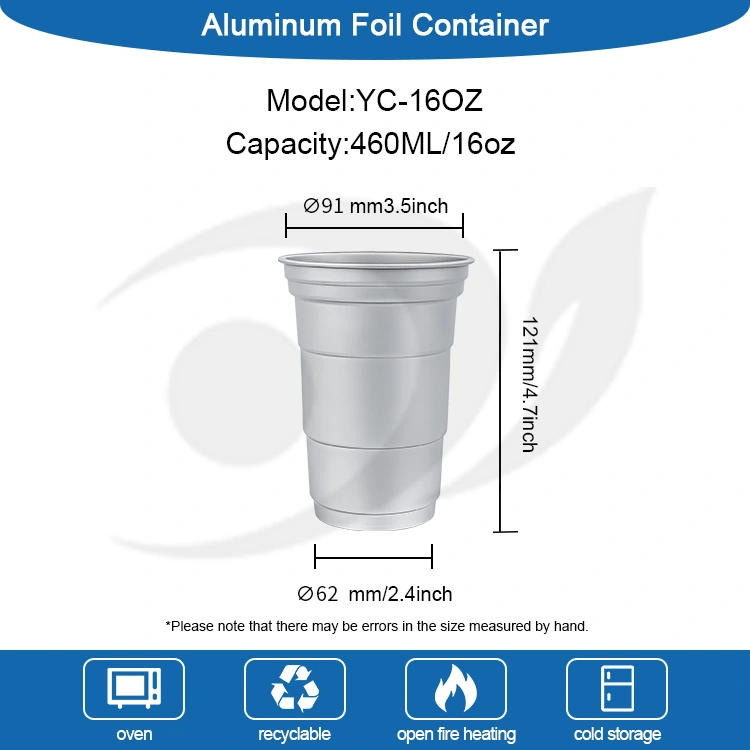 Yunchu е водечки кинески производител на чаши за пијалоци од алуминиумска фолија за еднократна употреба. Оваа чаша за пиење од алуминиумска фолија за еднократна употреба од 16 oz е шолја од алуминиумска фолија од 460 милилитри погодна за стандардни пијалоци како кафе и пиво. Се одликува со стандардизиран дизајн и главно е наменет за комерцијални корисници како што се кафулиња и занаетчиски барови со чести потреби за прилагодување. И покрај тоа што обезбедува ефикасно спроведување на топлина и основни перформанси за запечатување, оваа чаша за пијалок од алуминиумска фолија за еднократна употреба за рециклирање, исто така, става поголем акцент на брзите и флексибилни услуги за визуелно прилагодување на брендот.