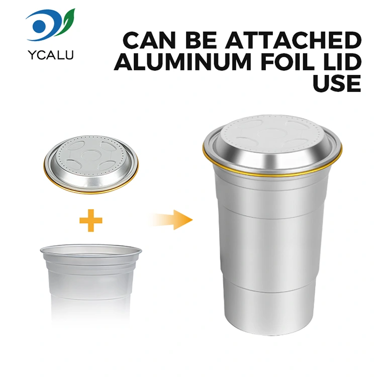 За разлика од општите контејнери, шолјата за пијалоци од алуминиумска фолија за еднократна употреба Yunchu 16oz е специјално дизајнирана да обезбеди решенија за пакување за брендови во специфични сценарија. Со својата компактна големина (460 милилитри), овој приспособлив за еднократна употреба чашка за пијалоци од алуминиумска фолија од 16 oz одговара на навиките за потрошувачка на инстант пијалоци за една порција. Оваа прилагодена алуминиумска фолија за чаши за еднократна употреба од 16 oz е особено погодна за активности за носење, пазари или кампување, надвор од неговите практични функции. Првенствено, тоа може да помогне да се зголеми вредноста на брендот.