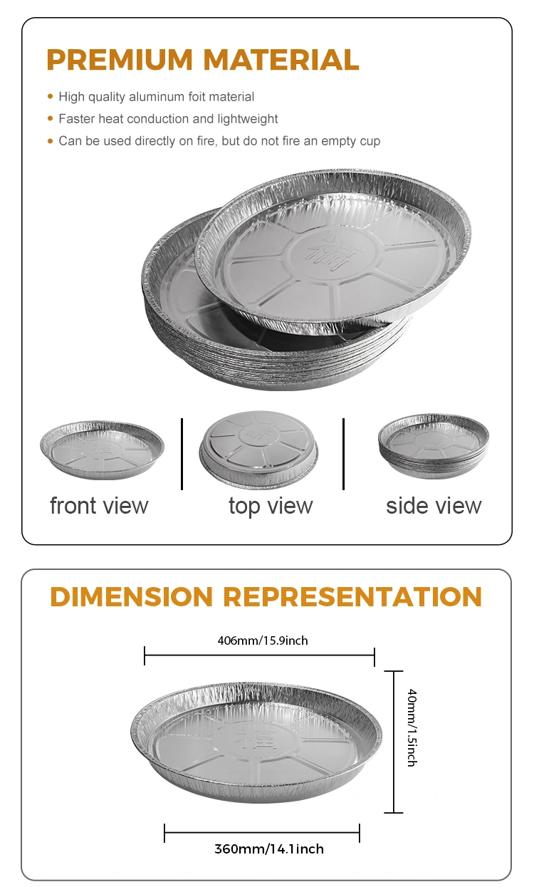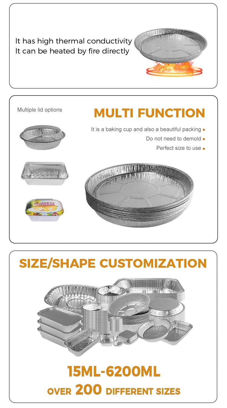 Обезбеден е модел на добавувач на алуминиумска алуминиумска фолија YR3700 е обезбеден контејнер за храна со храна од сребрена алуминиумска фолија. Контејнерот има дијаметар од 406 мм (околу 15,9 инчи) на врвот, 360 мм (околу 14,1 инчи) во дното, висина од само 40 мм (околу 1,5 инчи) и капацитет од околу 3.700 мл (околу 130,5 мл). Пареата со отворен пламен е погодно и хигиенско, печење во рерна, отпорност на висока температура 400 ° C не е изгорено или скршено, печењето на рерна не е лепливо, не се плаши од мрсна и намерна скара, поради неговата можност директно да контактира со отворен пламен, корисниците не треба да се грижат за безбедносните проблеми. Контејнерите на алуминиумска фолија се отпорни на високи температури, многу отпорни на печење и не се лесни за горење или кршење. Работ на целосната ролна е без масло, спречувајќи храна да се лепи до wallидот на тенџерето, а заштитата е поинтимна.