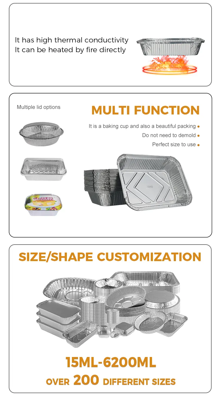 Кутија за ручек за печење за еднократна употреба на фабриката за алуминиумска фолија Јунчу Сад со сребрена алуминиумска фолија е погоден за повеќето сцени, без разлика дали се работи за ресторан за скара, западен ресторан, домашно зготвен ресторан или пекара, оваа кутија за ручек со сребрена алуминиумска фолија може да ја подобри ефикасноста. Рестораните за скара може директно да го користат за да служат ражен на скара, зеленчук на скара и морска храна на скара. Сребрениот изглед е поврзан со миризливи состојки. Има целосно визуелно влијание и привлекува внимание кога се служи. Дизајнот без чистење го намалува обемот на работа при миење садови во кујната и ги заштедува трошоците за работна сила. Особено е погоден за брзи оброци за време на шпицовите периоди на јадење. Пекарите го користат за да служат печени колачи, тартови со јајца и бисквити. Може да се печат директно во рерна и не треба да се печат откако ќе се испечат. Менувањето на чиниите и нивното директно ставање на продажба е погодно додека се одржува температурата и обликот на десертите; Домашните ресторани може да се користат за носење, а дизајнот кој не протекува може ефикасно да спречи излевање на супата. Зачувувањето на топлината на алуминиумската фолија може да го продолжи времето на константна температура на храната. За кампување, излети, скари на отворено и проблеми со носење гломазни садови и чистење по оброците, оваа кутија за ручек од алуминиумска фолија за еднократна употреба совршено ги решава болните точки на патувањето на отворено. Материјалот е тенок и лесен, а лесно се чува. Може да се превиткува и наредени по желба, не зазема простор во вашиот ранец и ќе го прави без мака за носење.
