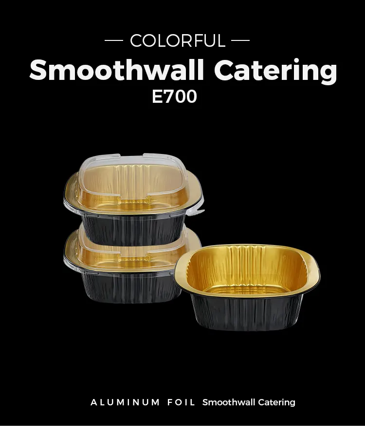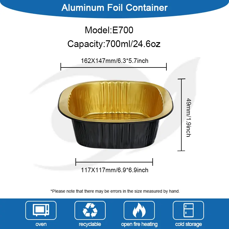 Контејнерите од алуминиумска фолија со светло златен ѕид за еднократна употреба на добавувачот на алуминиумска фолија, црно златна, се направени од фолија од алуминиумска легура 8011 за храна. Тие се обработени со процеси на жарење и стерилизација на висока температура за да се формира густ оксиден слој на површината. Тие немаат тешки метали и немаат мирис. Тие можат да бидат во директен контакт со сите видови храна и да спречат таложење на штетни материи на високи температури. Без разлика дали се користат за чување топли јадења, ладни јадења, десерти или сосови, тие можат да ја заштитат безбедноста на храната и да се усогласат со повеќекратните безбедносни сертификати како што се FDA и SGS, што го прави секој залак посигурен. Уникатниот црно златен дизајн на светло ѕид ја разбива монотоната текстура на традиционалните контејнери од алуминиумска фолија. Облогата од мат црно злато и мазната ѕидна површина даваат чувство на висока класа. Не само што има извонреден изглед, туку може ефикасно да ја блокира светлината и кислородот, да ја одложи оксидацијата на храната, цврсто да ја заглави аромата и влагата на храната, да избегне пренос на мирис и да го задржи оригиналниот вкус на храната долго време. Мазната ѕидна површина нема жлебови или брчки, што ја прави помала веројатност да размножува бактерии и лесно се чисти. Исто така, може подобро да се прилагоди на приспособувањето на печатењето, помагајќи им на угостителските брендови да го подобрат своето препознавање и квалитет.