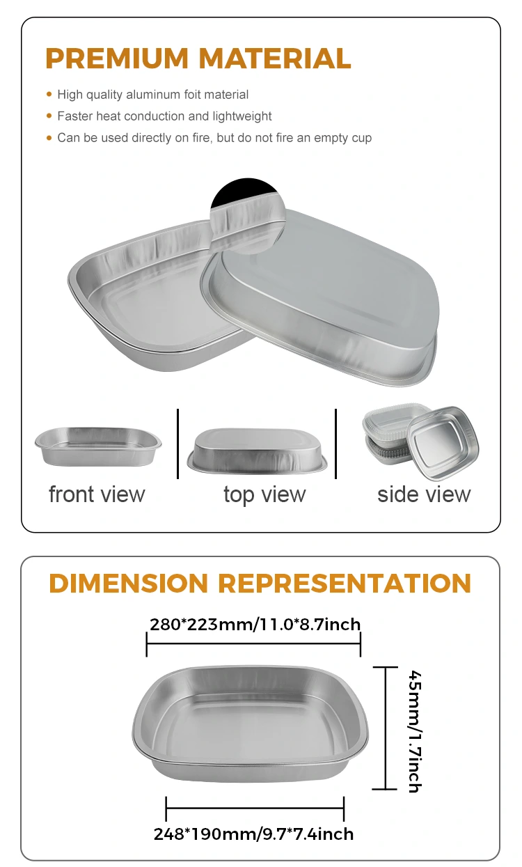 1. Yunchu најновото јадење за еднократна употреба во кетеринг, сребрени квадратни контејнери со алуминиумска фолија имаат извонредни изолациски својства, осигурувајќи дека храната останува топла при испорака. Запечатениот дизајн ефикасно ја задржува влагата и аромата, враќајќи го свежиот и сочен вкус и вкус на храната како што беше кога се готви.