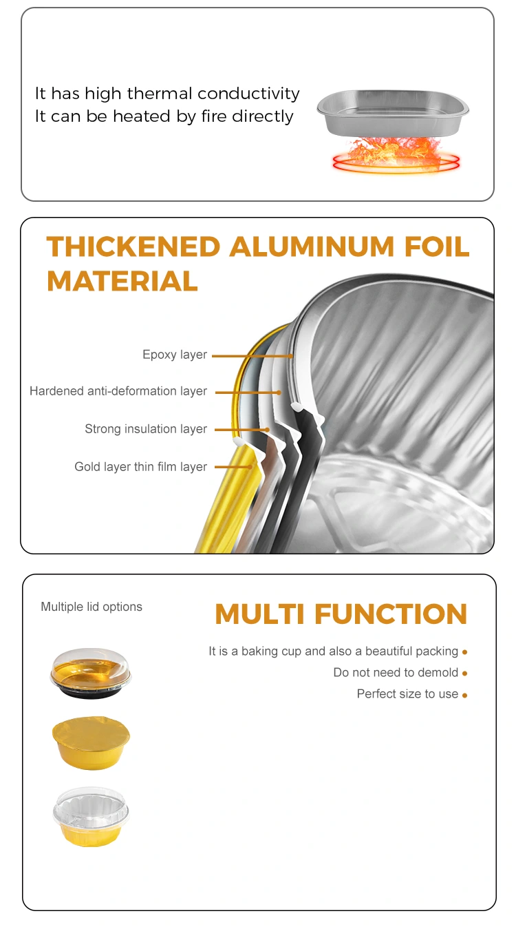 Тоа е совршено пакување за тартови со јајца, пусти, кекси, единечни парчиња пица или ронливи колачи. Изолационото својство на алуминиумската фолија помага да се одржи топлината и меката текстура на печивата веднаш по нивното печење; совршено го задржува вкусот и е погоден за носење од пекари и кафулиња.