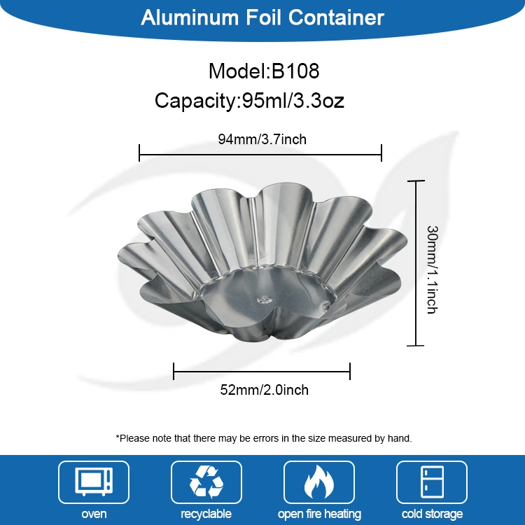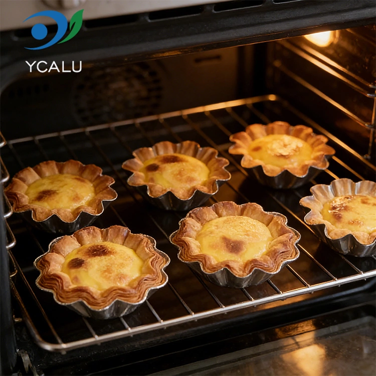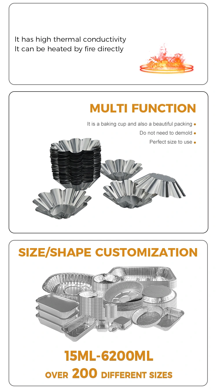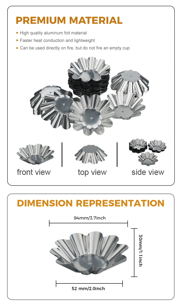 Надворешни и удобни сцени: Лесни и преносливи, погодни за кампување на отворено, излети, забави и други сцени. Тартите и грицките со јајца може да се подготват однапред и да се стават во контејнери без да се носат тешки листови за печење. Тие може да се отфрлат директно по јадење. Лесно се чисти и не зафаќа простор. Може да се користи и за пакување за носење. Својствата на запечатување и зачувување на топлина на материјалот од алуминиумска фолија можат ефикасно да ја одржат температурата и вкусот на десертите и да избегнат истекување и деформација за време на транспортот.
