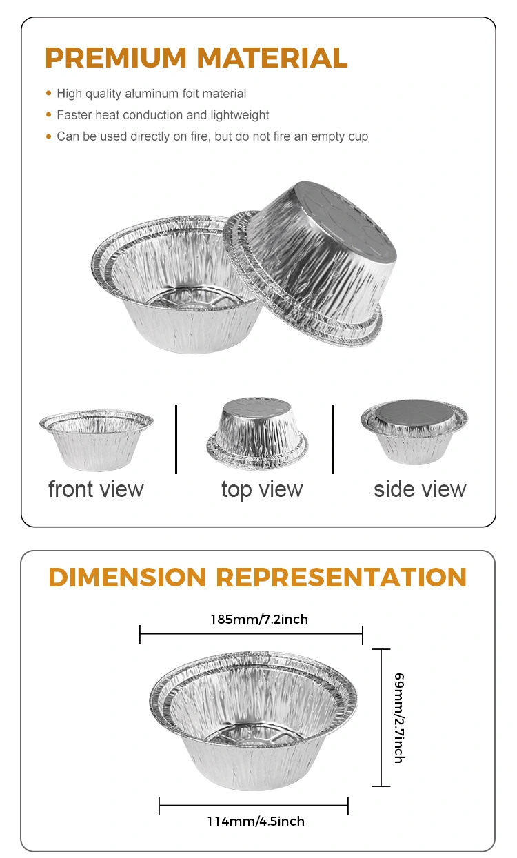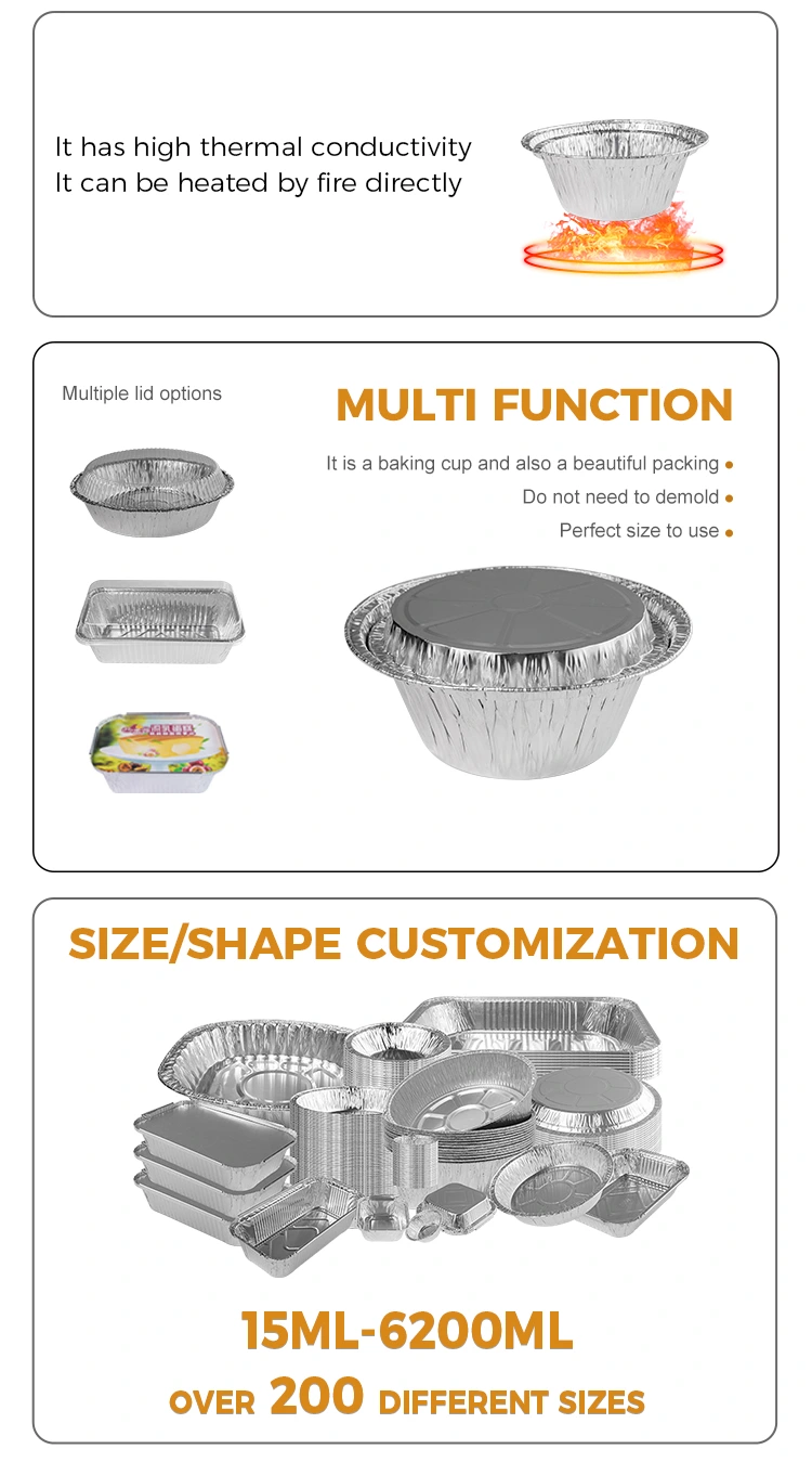 Контејнерот за сребрена фолија за алуминиумска фолија од алуминиумска фолија за еднократна употреба на гратини има уникатен дизајн, лесен и лесен за употреба, со тежина само 9,9 грама, што го олеснува складирање и складирање, заштеда на простор и време на сместување. Производот е произведен со употреба на напреден процес на лесен wallид со мазна и рамна површина, што го прави идеален за етикетирање и скенирање на работа по преработката на храна во големи супермаркети. Неговиот простран капацитет е доволен за да одржи разновидна дневна храна и закуски, исполнување на различни потреби за употреба. Како производ за еднократна употреба, нема потреба да се чисти, значително намалување на трошоците за работна сила. Покрај тоа, производот е опремен со алуминиумска фолија за миленичиња и алуминиумски фолија за запечатување на топлина, кој има одлично истекување на нафта и водоотпорни перформанси и може да одржува стабилност и деформација на високи температури, а со тоа подобрување на ефектот на свежина и зачувување на топлината на храната, особено кога е запечатена и транспортирана.