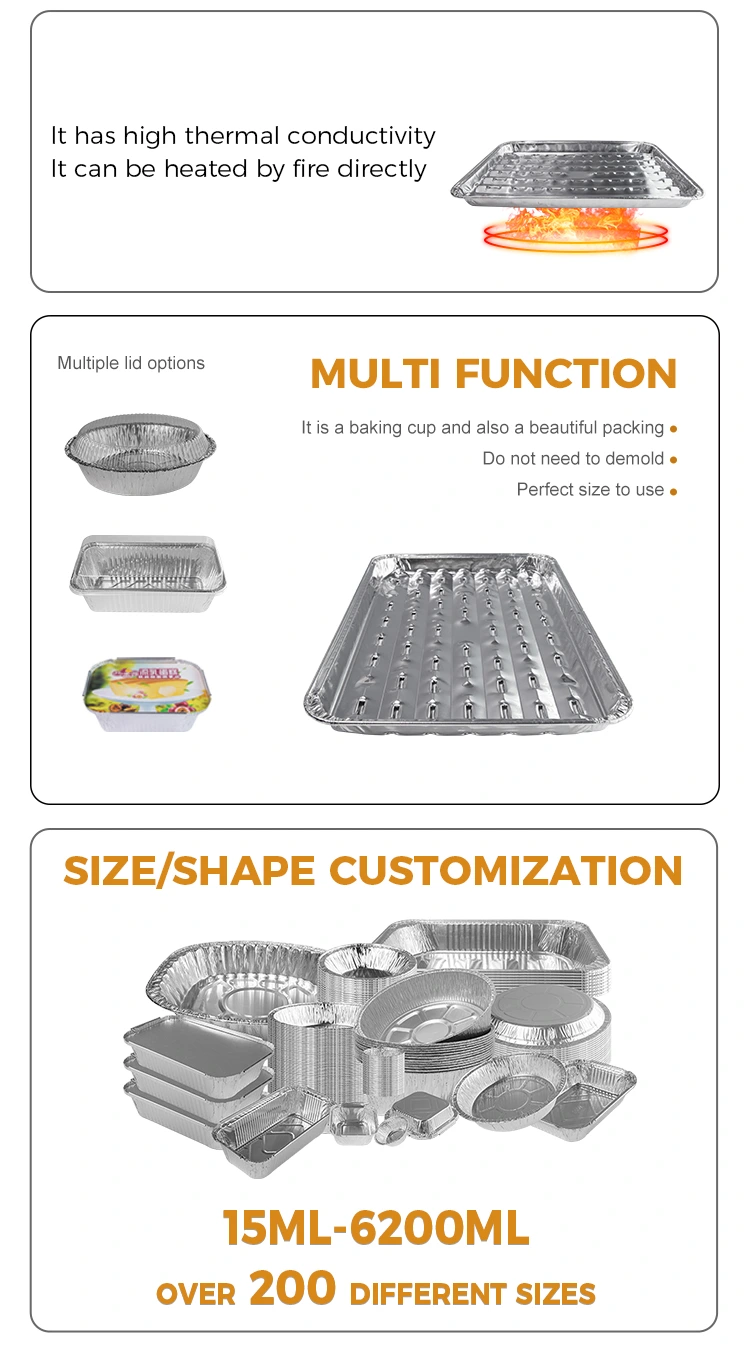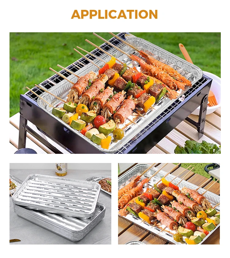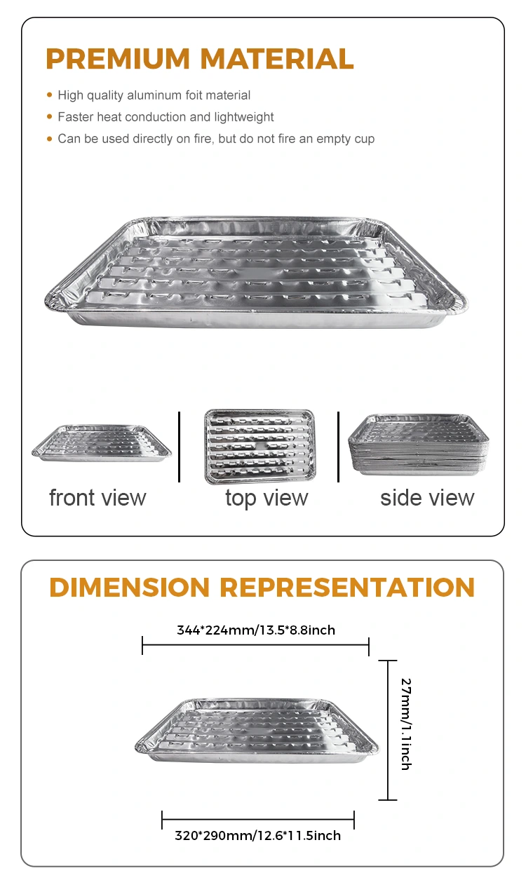 Добавувачот на решетки за еднократна употреба на алуминиумска алуминиумска фолија е погодна за печење на отворено и затворено, оваа фиока за печење има уникатен дизајн на дупки, нема потреба да се грижите за проблемот со чадот од нафта. Дизајнот на дупките овозможува брзо спроведување на топлина и повеќе униформа загревање, избегнувајќи локално прегревање на традиционалните фиоки за печење. Без разлика дали се кампува во пустината или семејниот собир, оваа решетка обезбедува чиста, здрава околина за вашата скара. Тавата за решетки за еднократна употреба на алуминиумска алуминиумска фолија е направена од материјали за контакт со храна за да се обезбеди хигиена и безбедност за време на процесот на скара. Висококвалитетниот материјал од алуминиумска фолија не само што е издржлив, туку има и мазна површина и нема мирис, овозможувајќи ви да уживате во вашиот оброк без да се грижите за какви било здравствени ризици. Оваа тава за печење е дизајнирана со сите детали во умот, од изглед до практичност.