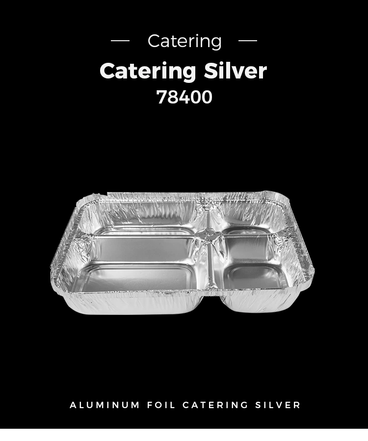 Yunchu Aluminum Foil Supply Factory launched a new Disposable multi-compartment fast food Silver Aluminum Foil Containers, model number 78400. The container is cleverly designed, with an upper diameter of 244 mm (9.6 in) and 195 mm (7.6 in) and a lower diameter of 217 mm (8.5 in) and 168 mm (6.6 in), with an overall height of only 41 mm (1,6 во). Со капацитет од приближно 1020 ml (36,0 мл), тој е погоден и практичен за одржување на најразлична храна во четири оддели.