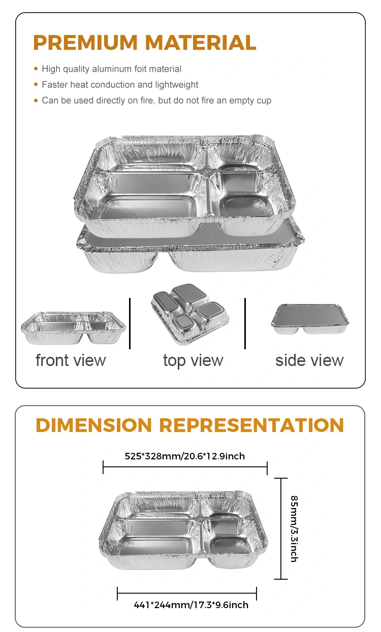 За еднократна употреба мулти-одделенија за брза храна со сребрена алуминиумска фолија со капаци на хартија се одвиваат добро во есен и зима заради нивните добри својства за задржување на топлина. Без разлика дали станува збор за свежо изработена топла чорба или друга топла храна, може да одржува соодветна температура долго време, дозволувајќи им на потрошувачите да уживаат во топла храна.