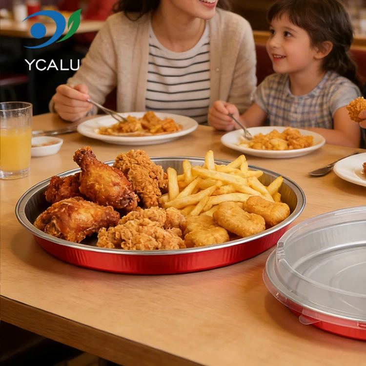 Yunchu добавувач на алуминиумска фолија C900 Пакување во тава за еднократна употреба за пица Круг сад за алуминиумска фолија е направен од сурова алуминиумска фолија за храна, без мирис и нечистотии, што го прави безбедно да се допира храната со сигурност. Дебелината е униформа и цврста и може да издржи високи температури до 250°C и ниски температури до -20°C. Свежо топла пица може да се сервира директно. Може да се чува во фрижидер и да се чува свеж без да се менува садот. Може да се јаде директно со загревање, што во голема мера ја подобрува ефикасноста на испораката на храна и ја спасува маката за чистење. Капакот PET од алуминиумска фолија ефикасно го блокира навлегувањето на водена пареа и воздух и го спречува истекувањето на маснотиите. Класичниот кружен лак точно одговара на сите типови форми на пица, со повеќе големини достапни од 7 до 9 инчи. Совршено е погоден за различни спецификации како рачно изработена пица, италијанска пица и американска густа кора. Нема дополнителен простор за да спречите лизгање на пицата и паѓање на додатоците. Процесот на едноделно обликување создава стабилна форма, отпорен е на притисок и судир и не се деформира или оштетува лесно за време на транспортот. Таа, исто така може да ја задржи својата форма кога е наредена и складирана, целосно ја решава болката од лесно оштетената амбалажа за носење и обезбедува секоја пица да биде испорачана во добра состојба.