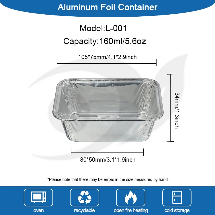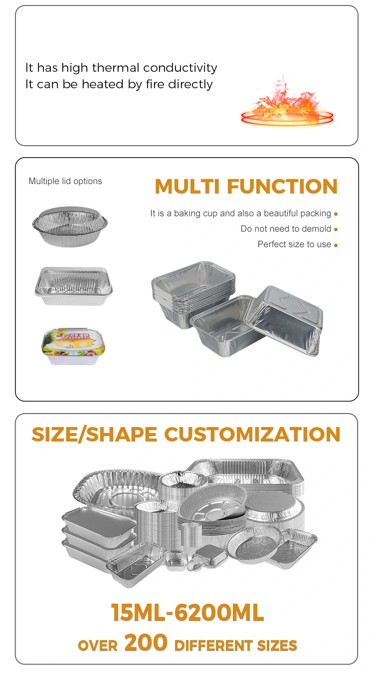 Правоаголниот контејнер со сребрена алуминиумска фолија од фабриката за алуминиумска фолија за еднократна употреба, е направен од задебелен материјал од алуминиумска фолија за храна, а внатрешниот ѕид е обработен со премаз од типот на храна. Не е токсичен, без мирис и не ослободува штетни материи, што го прави директниот контакт со храната побезбеден. Тој е во согласност со домашните и странските безбедносни стандарди за контејнери во контакт со храна, со опсег на отпорност на температура од -20°C до 250°C. Може директно да се стави во рерна, пржење на воздух, микробранова печка и фрижидер за замрзнување. Нема потреба да го менувате садот од обликување во фрижидер во печење на висока температура. Материјалот од алуминиумска фолија може да се рециклира и повторно да се користи, што е во согласност со концептот за зелена заштита на животната средина и го намалува отпадот од ресурси. Производот е тенок и пренослив, а може да се натрупа и складира, заштедувајќи простор за складирање и транспорт. Заштедува трошоци кога се користи во серии, земајќи ја предвид практичноста и заштитата на животната средина.