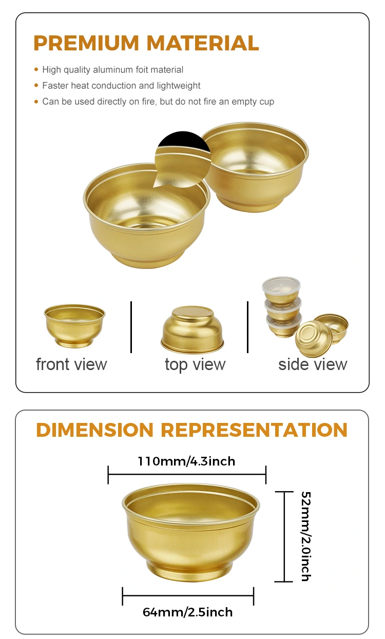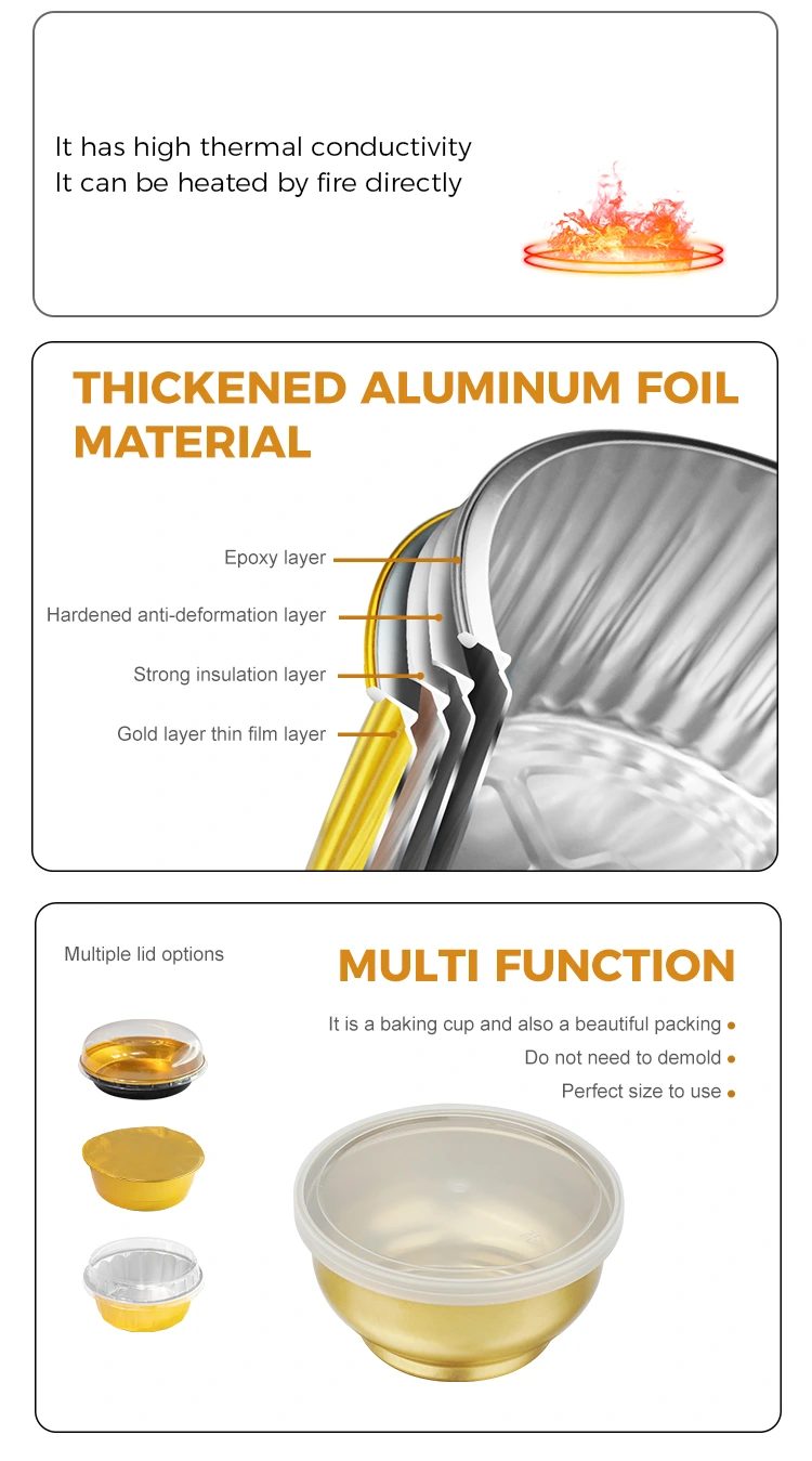 Yunchu aluminum foil supplier, Disposable round small gold bowl Aluminum Foil Containers, thickened aluminum foil, high hardness, not easily deformed, can be sealed without leakage, strong heat resistance, reusable, serving as both a mold and packaging, high-temperature sterilization aluminum foil packaging is safe, hygienic, and has good thermal insulation properties - strong heat resistance - can Бидете пареа, фрижидер, замрзнати и може да се рециклираат. Внатрешна мембрана на храна, метална материја, спарен со внатрешна мембрана, безбојно и без мирис, тегла, ја прави малата тегла лесно деформирана, обезбедувајќи добра заштита, силна безбедност и сигурност за запечатување и сигурност, цврсто шишето се комбинира со телото на шише, силното запечатување ја одржува свежината на производот за подолго време, целосно нови материјали што се безбедни, еколошки пријателски и нелегални. Контејнери за алуминиумска фолија од алуминиумски садови со еднократна употреба, се користат во разни прехранбени индустрии, како што се фабрики за храна, фабрики за бонбони, фабрики за сушени овошја, пекари, специјализирани продавници за храна и сушени продавници за сортирање на овошје, итн.