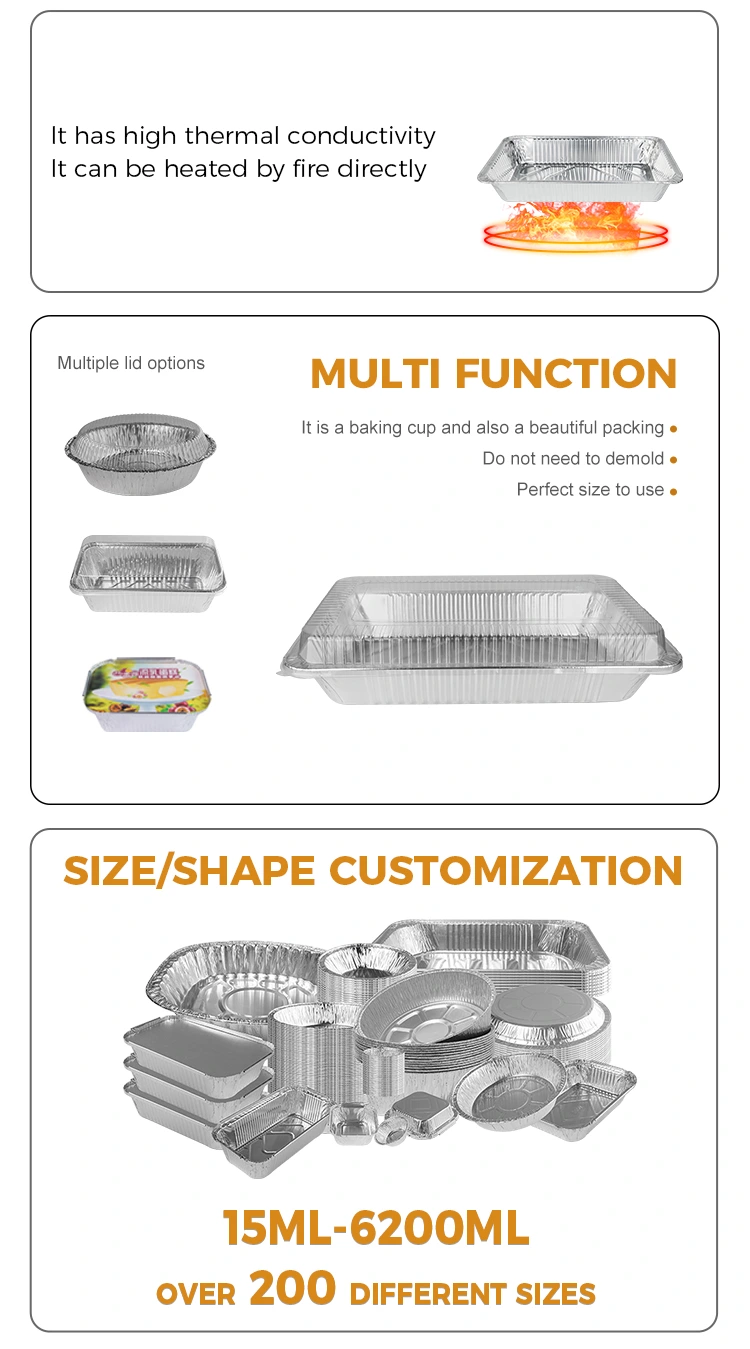 Карактеристики: Овој голем капацитет на отворено сад за печење, сребрена фолија е изработен од материјал од алуминиумска фолија од алуминиумска храна 8011-0, кој целосно го исполнува стандардот за контакт со храна, обезбедувајќи безбедност на храна без чуден мирис и посигурен за употреба. Има конкавен и конвексен внатрешен дизајн, кој е посигурен за употреба. Опремата е без чистење и добро ја штити лагерната лагер. Без разлика дали печење или загревање преку отворен пламен, нема потреба да се грижите за деформација на контејнерот или да влијае на безбедноста на храната.