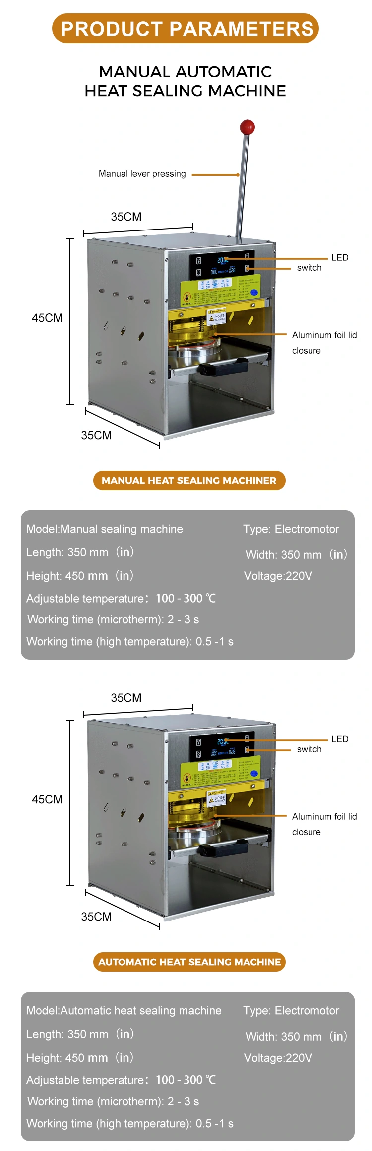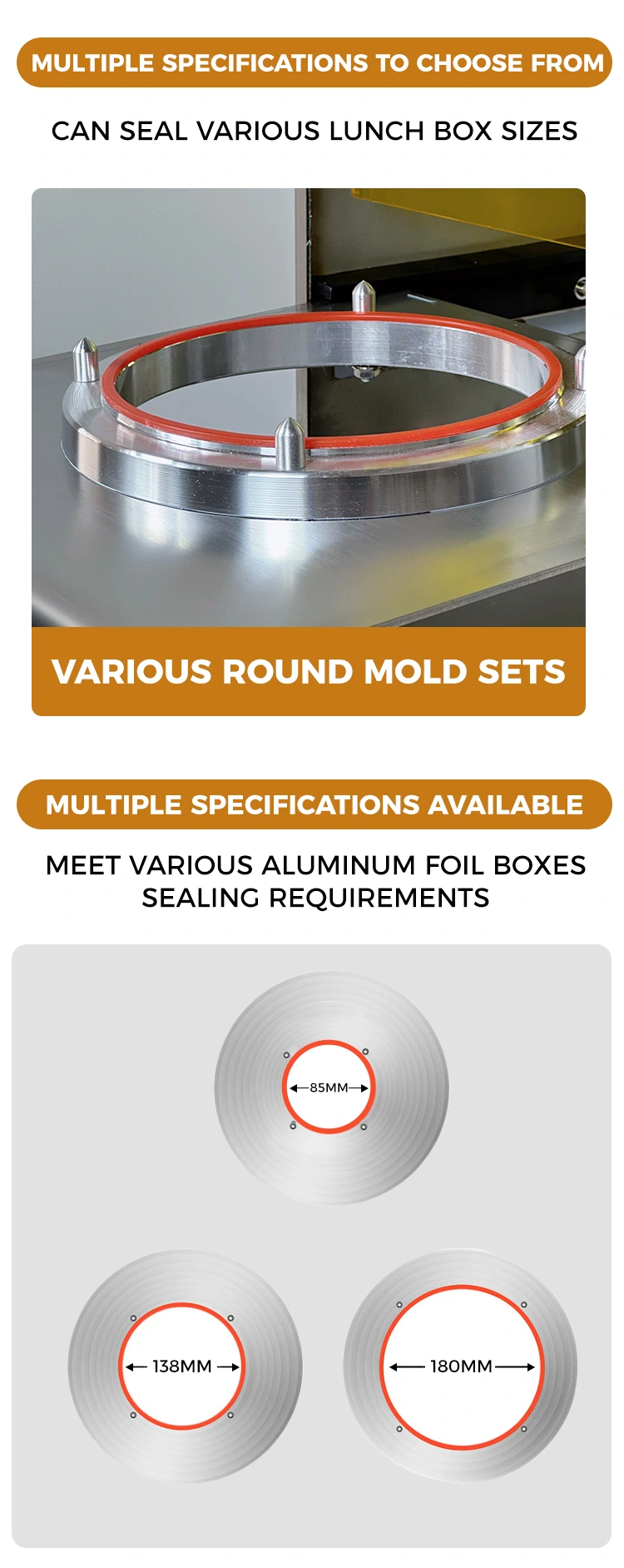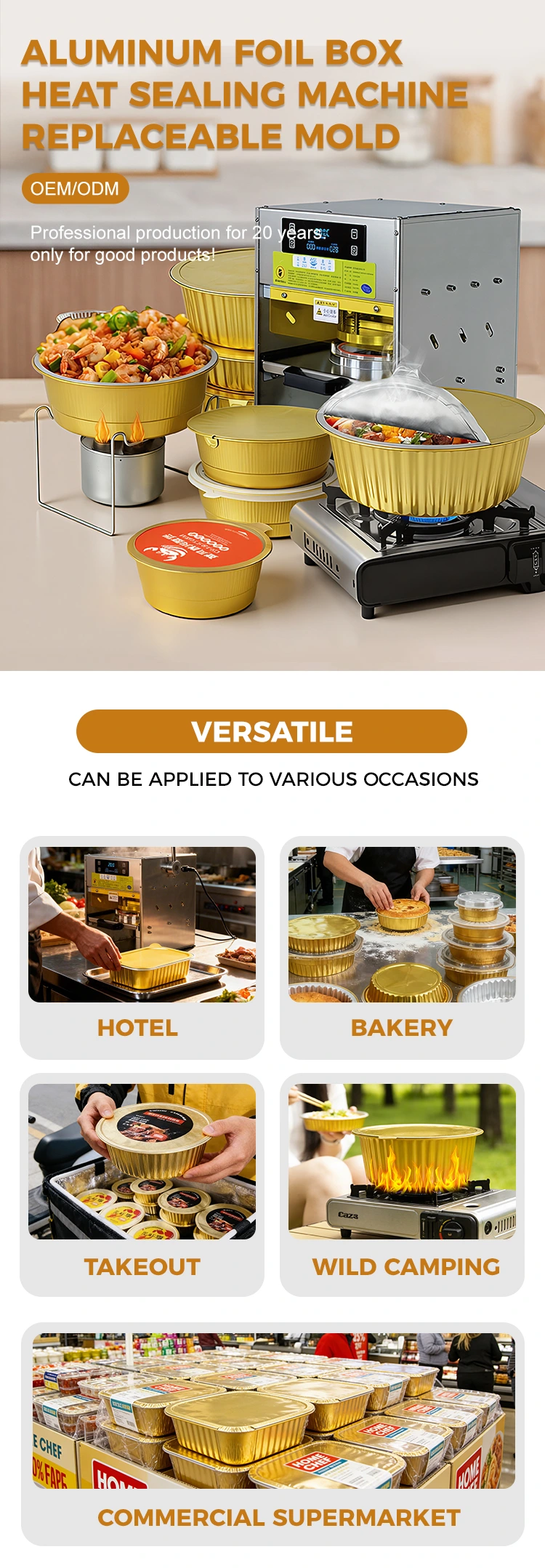 Силна приспособливост и едноставно ракување: Совршено компатибилен со оваа златна кутија за ручек, а исто така компатибилен со различни пакувања од композитни филмови од PP/PE. Не е потребна професионална обука, а можете да започнете за само 10 секунди. Само затворете ја и порамнете ја кутијата за ручек и нежно притиснете го заптивката за топлина 3 до 5 секунди за да го завршите запечатувањето, значително подобрување на ефикасноста на пакувањето.