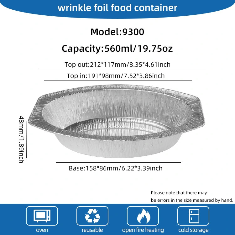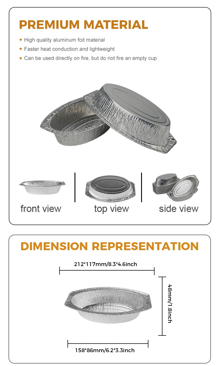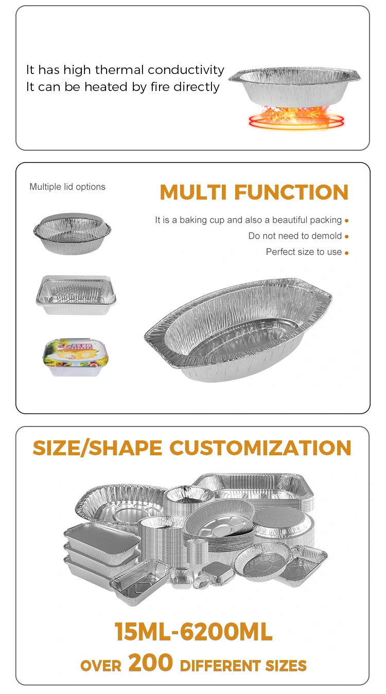 Добавувачот на алуминиумска фолија на Yunchu нуди овален печен леб сребрена алуминиумска фолија контејнери за готвење дома, пекари, продавници за ланци и испорака на ладилна храна. Изработен од алуминиумска фолија материјал од алуминиум, овој сад има уникатна овална форма што го прави да се истакнува меѓу многуте кутии за печење сребрени. Овој контејнер е особено погоден за држење на топли марамчиња, овошје, леб и секакви видови на храна и може да ги задоволи потребите на широк спектар на прибор за јадење. Поради својата добра термичка спроводливост, може рамномерно да се распаднат високите температури, осигурувајќи дека храната се загрева рамномерно. Покрај тоа, има одреден капацитет на оптоварување и отпорност на притисок, одржувајќи ја стабилноста дури и во случај на повеќекратни магацини, спречување на деформација и е идеална за употреба за време на транспортот. Со цел подобро да се прилагодат на различни сценарија и потреби, овој сад може да се прилагоди и според барањата на клиентите и да обезбеди соодветни капаци за дополнителна практичност.