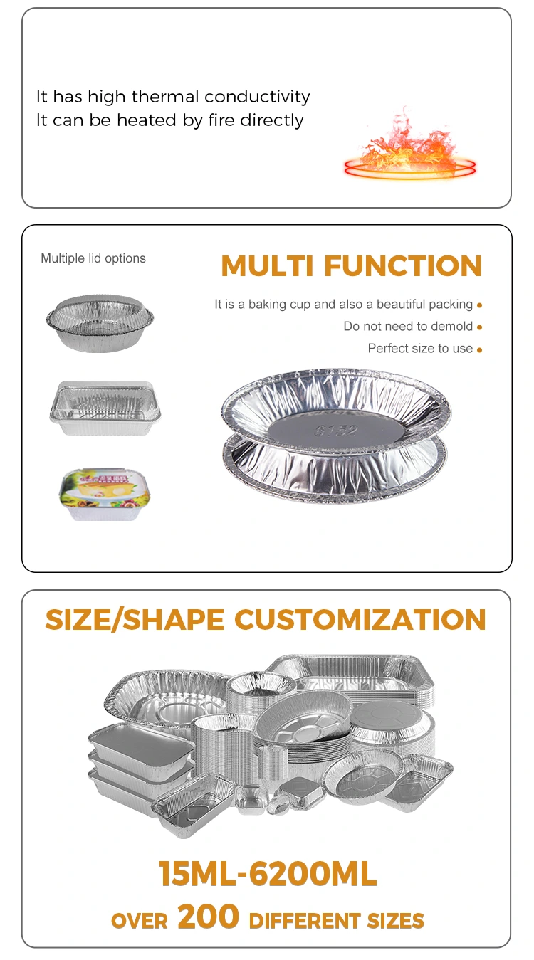 Овални јајце -алуминиумски алуминиумски алуминиумски алуминиумски алуминиумски алуминиумски контејнери од јајце е уникатна на пазарот со одличните карактеристики на производот. Овој контејнер спроведува рамномерно топлина и не гори лесно, осигурувајќи дека храната се загрева рамномерно и готви вкусна и безбедна храна. Неговите својства отпорни на нафта и отпорни на дамки го олеснуваат Демолинг, со плетени облици околу неа за лесен пристап, и заоблено и мазно дно што може брзо да се спушти со само светло копче. Фрли го после употреба, нема потреба да се исчисти, што е безгрижно и хигиенски. Овој сад има голем капацитет и може да има повеќе состојки одеднаш, што го прави погоден за разни потреби за печење. Без разлика дали станува збор за печење курва, колачи или правење јајца од жолчка, колачи со чинии, скари и други деликатеси, тоа е разноврсен избор.