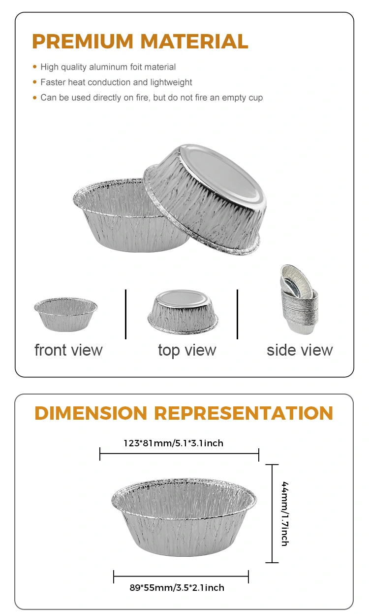 Yunchu Aluminum Foil Oval steamed cake Silver Aluminum Foil Food Container 6225 Barbecue and baking can be highly applicable, you can easily enjoy baking time, because the aluminum foil material of this oval steaming cake silver aluminum foil container can be corrosion-resistant, direct contact with food use, thickened material is not easy to break, strong and durable and tensile resistance is sufficient, can withstand high Температура -20 ° C ~ 250 ° C, загреано рамномерно, без необичен мирис, може директно да се контактира со отворен пламен, може да се користи со доверба, без разлика дали е со разновидна храна, сос, може да се примени на секоја категорија на угостителство, а исто така може да се спари со печени слатки, а малата алуминиумска чаша може да додаде поени во садот. На дното, има капак што е исцеден и фиксиран во страничното поле, што може да спречи храна да се лепи во садот за печење, што е лесно да се ослободи и чисти, и е лесен за транспорт и употреба.