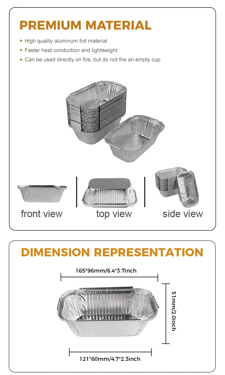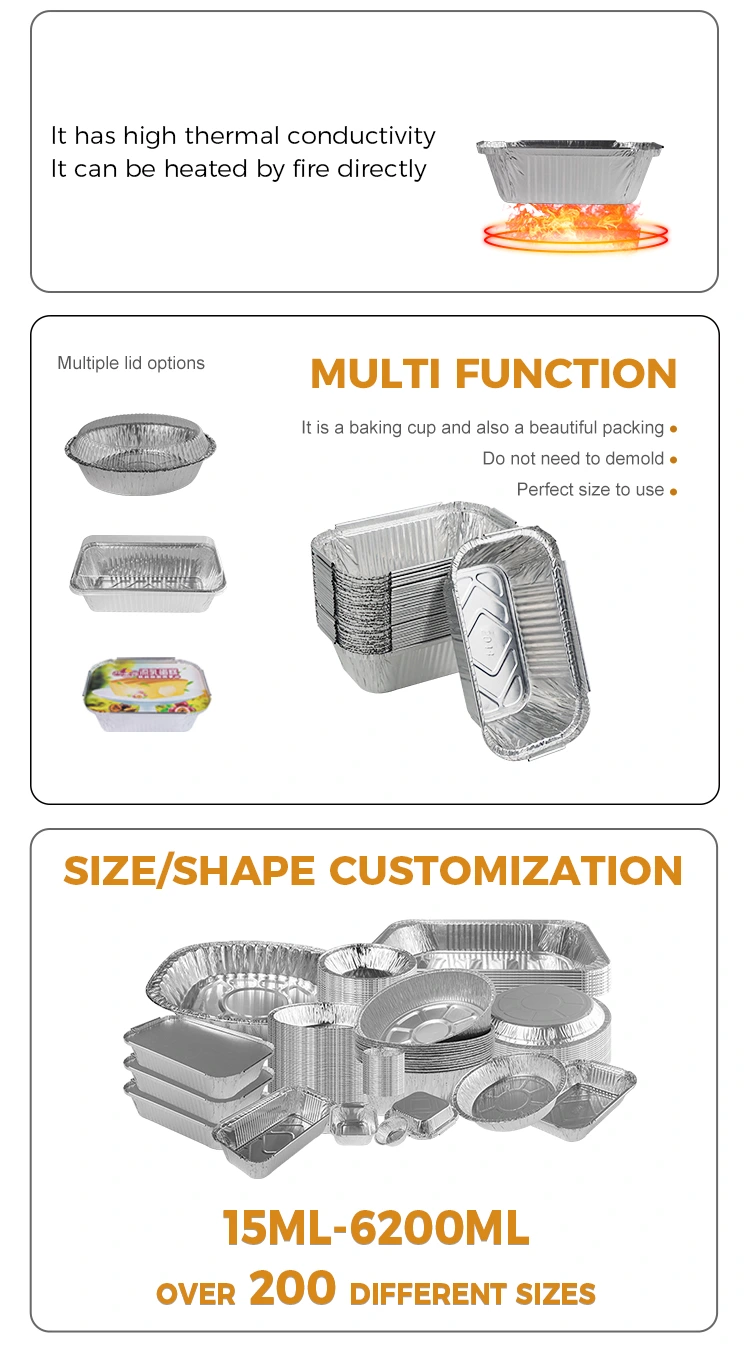 Карактеристики: Кутијата за ручек со алуминиумска фолија што ја нудиме е направена од 8011 алуминиумски фолија, кој има одлични перформанси за зачувување на топлина и може ефикасно да ја одржи температурата на храната, што ја прави вашата храна попривлечна. Особено, нашите правоаголни садови за печени оризови сребрени алуминиумски фолија не само што имаат својства на термичка изолација, туку можат да се комбинираат и со капаци на алуминиумска фолија или пластични капаци за миленичиња за да се олесни персонализираната прилагодување на логоата, со што се подобрува точките на меморијата на клиентите и подобрувањето на свеста за брендот.