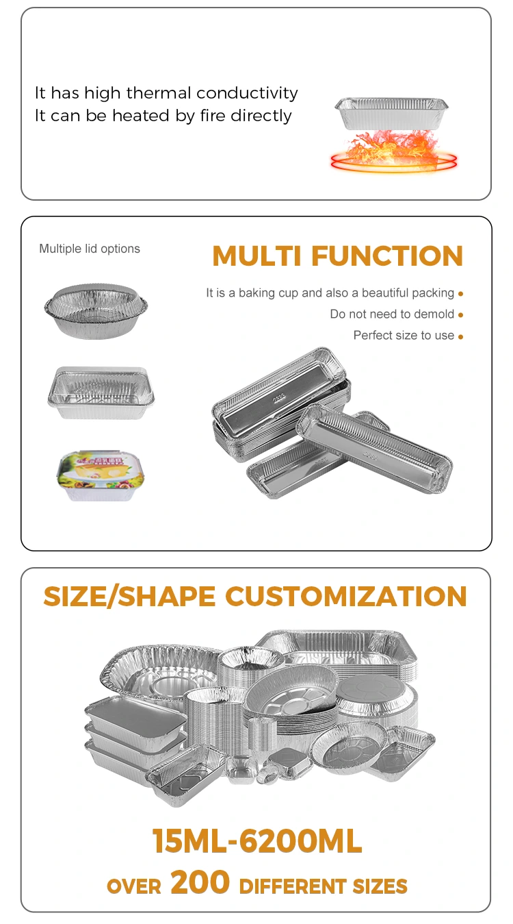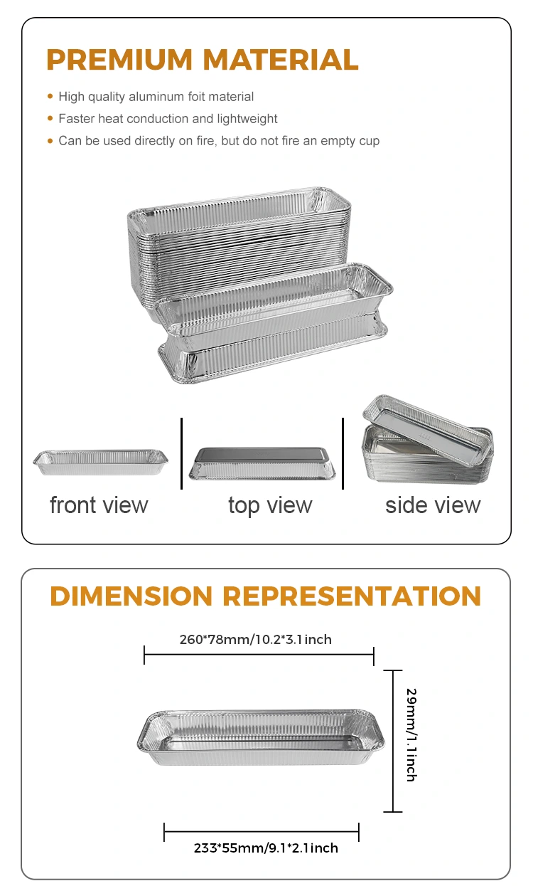 Карактеристики: Големката на големо за ручек е изработен од 8011 алуминиумски фолија, кој има добар ефект за зачувување на топлина и може да ја одржи температурата на храната, со што храната е повкусна и вкусна. Покрај тоа, нашиот правоаголен BBQ сребрена алуминиумска фолија контејнер исто така има функција за изолација на топлина и може да се совпадне со капакот на алуминиумска фолија и пластичниот капак за миленичиња.