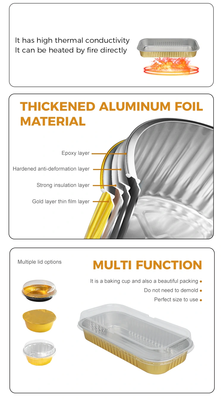 Понуда во кетеринг: погоден за испорака на лесни оброци во западен стил и печени десерти. Златниот изглед го подобрува имиџот на брендот, а материјалот од алуминиумска фолија исто така може да игра одредена улога во зачувувањето на топлината.