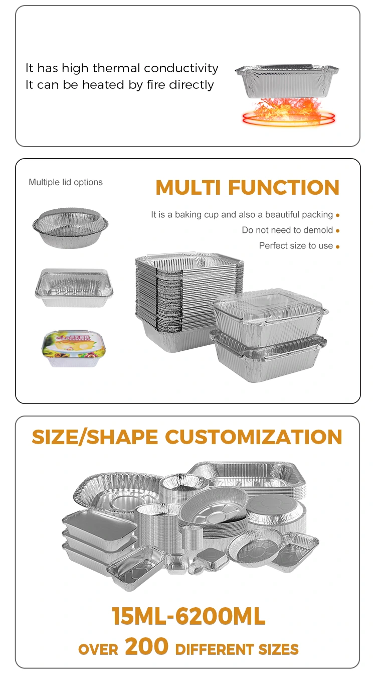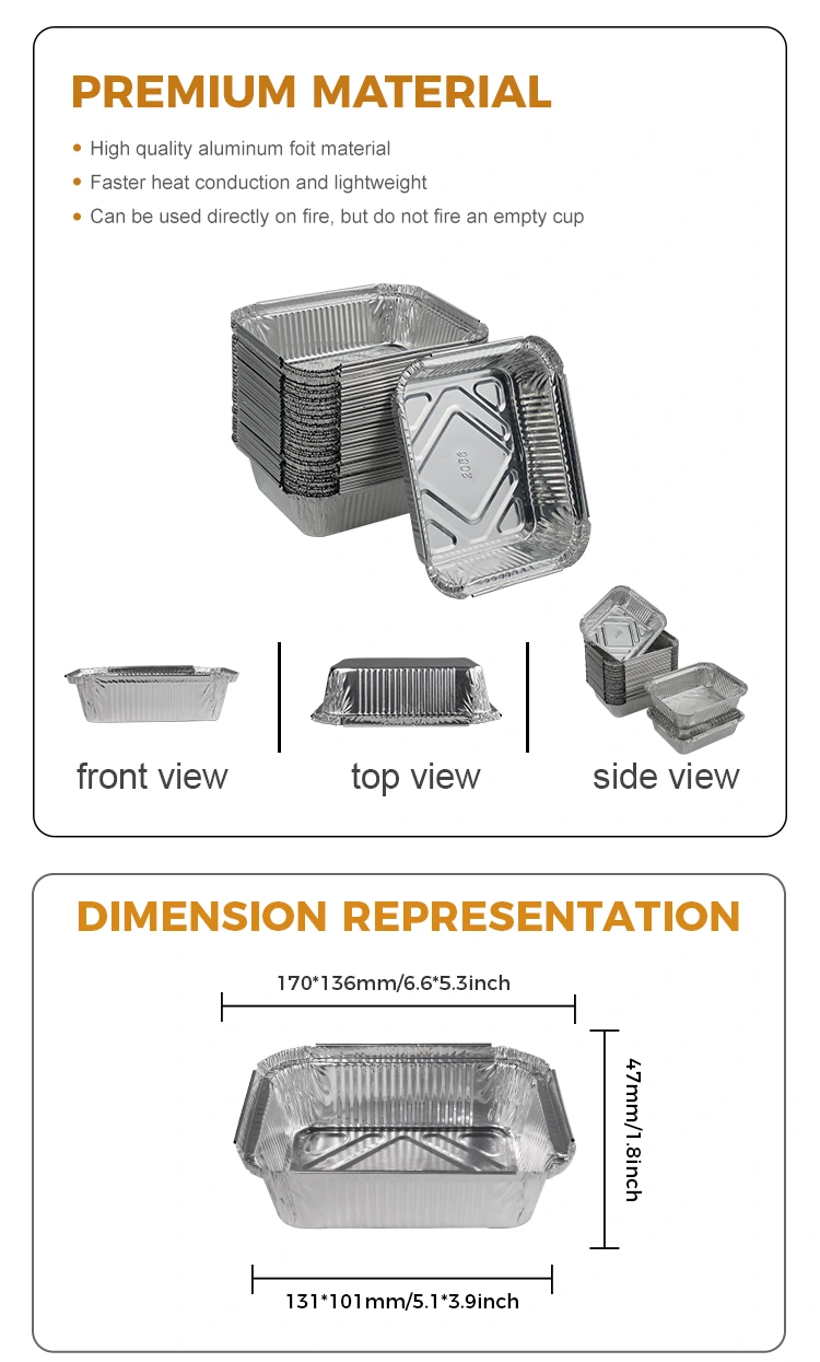 Материјалот на добавувачот на алуминиумска фолија на Yunchu, правоаголна гратин, пакувања од сребрена алуминиумска фолија е одличен, со употреба на висококвалитетен материјал за алуминиумска фолија, кој е и лесен и издржлив. Врвот е опремен со капакот на миленичиња или алуминиумска фолија, а на дното има капак што е исцеден и фиксиран во страничната кутија за да се обезбеди безбедност и хигиена на храната. Овие сигурни физички својства и дизајн што е лесен за корисниците ги прават првиот избор за преземање.