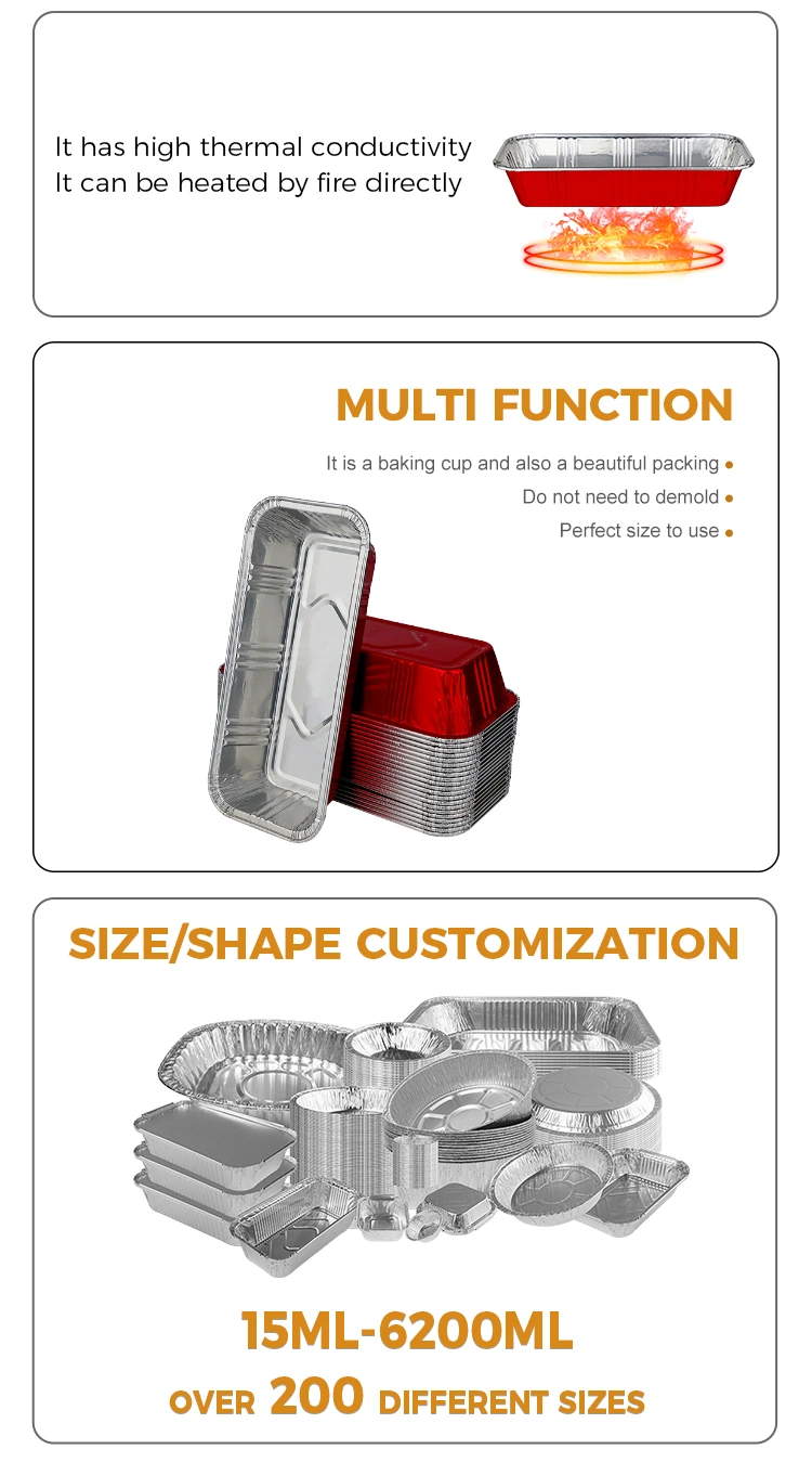 Алуминиумската фолија Јунчу ви обезбедува висококвалитетна правоаголна црвена пекарница Контејнерите со сребрена алуминиумска фолија, кои се дизајнирани да бидат издржливи и отпорни на топлина, можат рамномерно да ја спроведат топлината за да спречат јагленисување и имаат силно запечатување за да останат свежи.