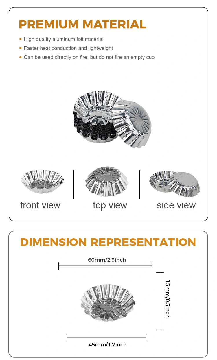 ​Yunchu aluminum foil supplier Round egg tart toy baking Silver Aluminum Foil Food Container, to meet different tastes, a variety of sizes to choose from, aluminum foil material is safe and non-toxic, made of aluminum foil material, with good thermal conductivity, safe and non-toxic for a variety of uses, better use, easy non-stick mold, smooth cup wall, bamboo skewer gently plucked, easy to eat, strong thermal conductivity, aluminum foil material is not easy to deform, waterproof/oil-proof, good thermal conductivity, can be put into steamer, air fryer, barbecue, etc., a variety of styles are available, different specifications and sizes are available for purchase, Can make egg tarts and other snacks, the finished product is beautiful and generous, one pot can make different flavors of food Закуски, бранови калапи, готовиот производ е убав, не е лесен за деформирање, долгорочно пареа, печењето нема да се деформира или пука, е погоден за изгледот на производот за да се заврши ефектот.