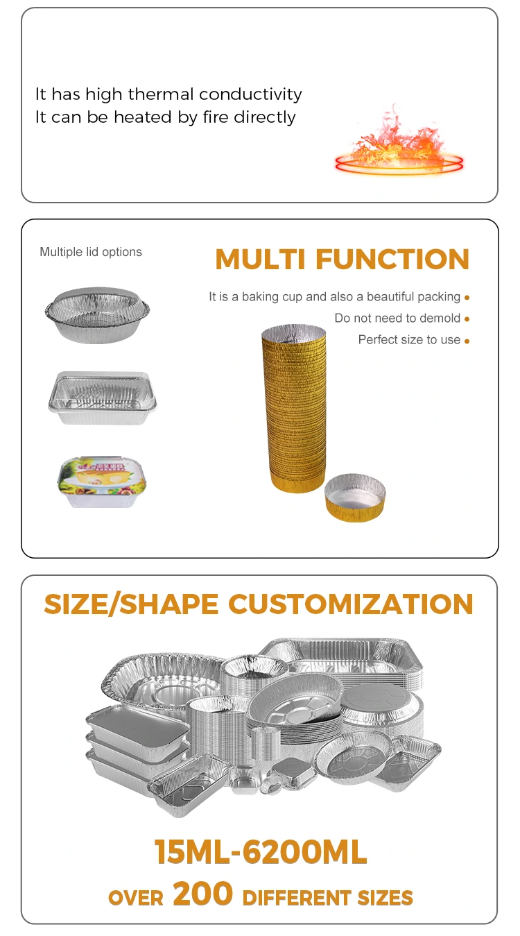 Овој тркалезен контејнер за храна со мала алуминиумска фолија за печење е погоден за пакување на најразлични мали производи за пекари, како што се макарони, колачиња и курви. Ние строго го контролираме секој чекор на производство во однос на контролата на квалитетот за да се осигураме дека сите производи ги исполнуваат националните стандарди за безбедност и поминале германско сертификација на ERP, сертификација на EU SGS и сертификација ISO9001.