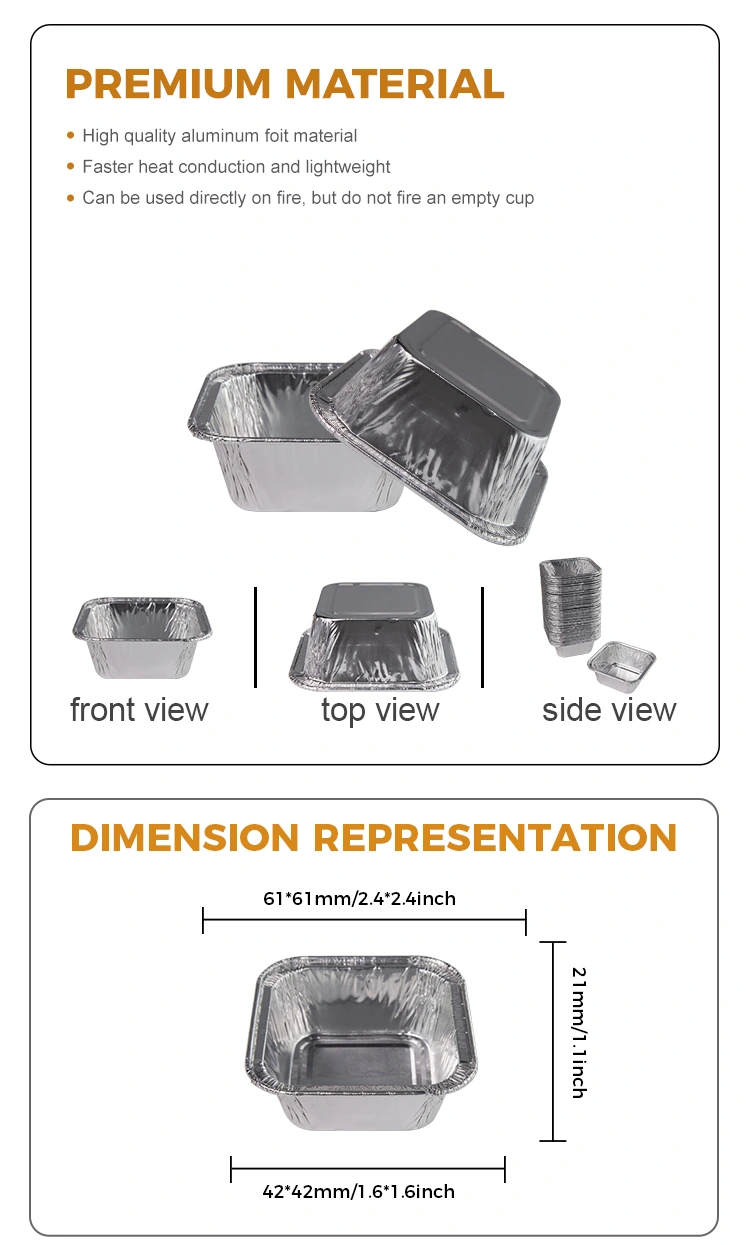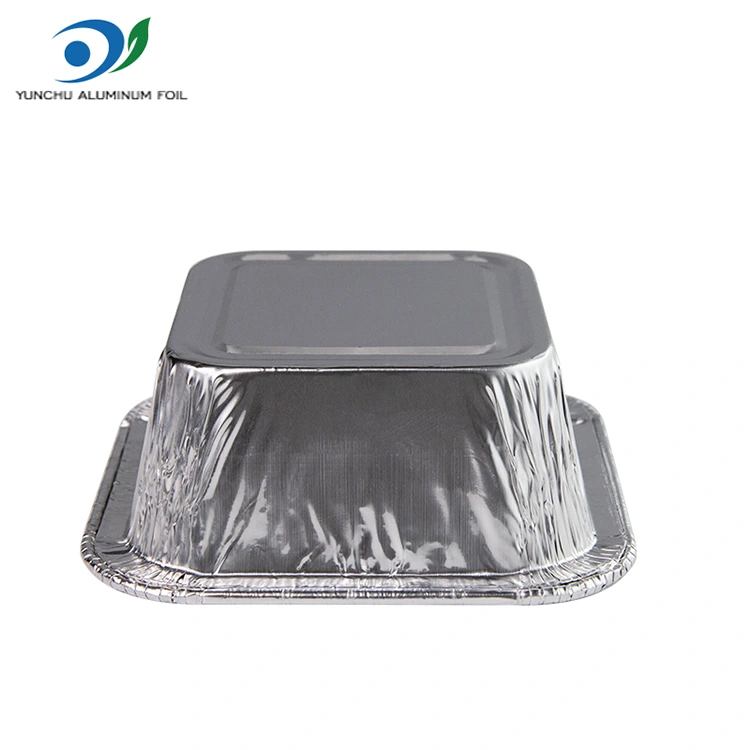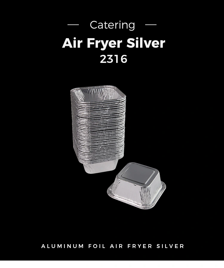 Yunchu aluminum foil supplier Square air fryer Silver Aluminum Foil Containers in catering, home air fryer production, with takeaway delivery, buffet sauces, banquets and other places, but also suitable for steamed eggs, chocolate, biscuits, small cakes, sauces and other ranges, whether it is with food or sauces, can be applied to every catering industry places, can also be used with baked goods, small Чашите со алуминиумска фолија може да се стават настрана додека додаваат точки на садовите, но исто така може да се мијат и да се користат без товар.