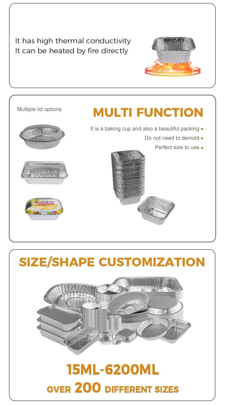 Контејнерот со сребрена алуминиумска фолија на квадратниот воздух користи висококвалитетен материјал за алуминиумска фолија, кој е лесен и издржлив. Врвот може да се прилагоди со транспарентен капак за миленичиња, а на дното има капак што е исцеден и фиксиран во кутијата за да се спречи храната да се лепи во садот за печење, што е лесно да се ослободи и чисти, и лесен за транспорт и употреба.