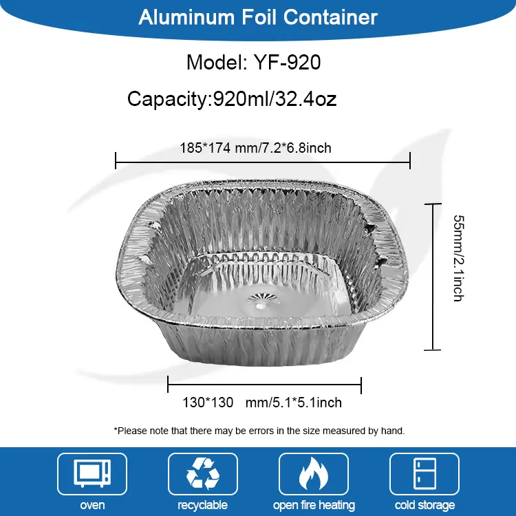 Yunchu Made in China Model YF920 квадратни сребрени пакување алуминиумска фолија контејнер е многу скромен по големина, со врвен дијаметар од 185*174 mm (7,2*6,8 инчи), основен дијаметар од 130*130 mm (5,1*5,1 инчи), висина од само 55 mm (2,1 инчи), и капацитет од 920 m (32.4 z). Оваа големина не само што е лесна за носење, туку може да задоволи и различни потреби за употреба.